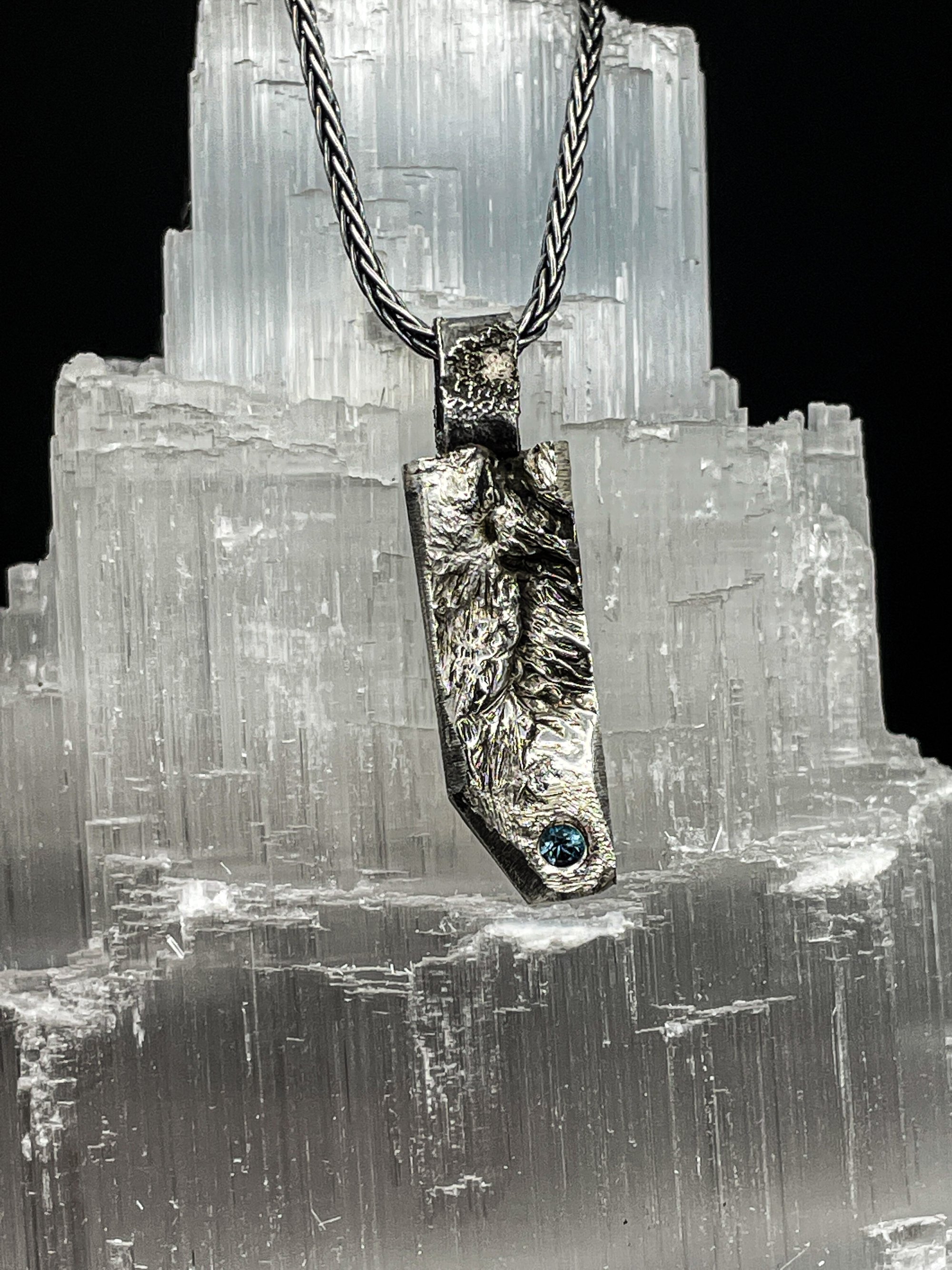Cast/Hand Fabricated Sterling Silver Pendant Adjourned with a Single 2mm Natural Hand Cut Blue Sapphire