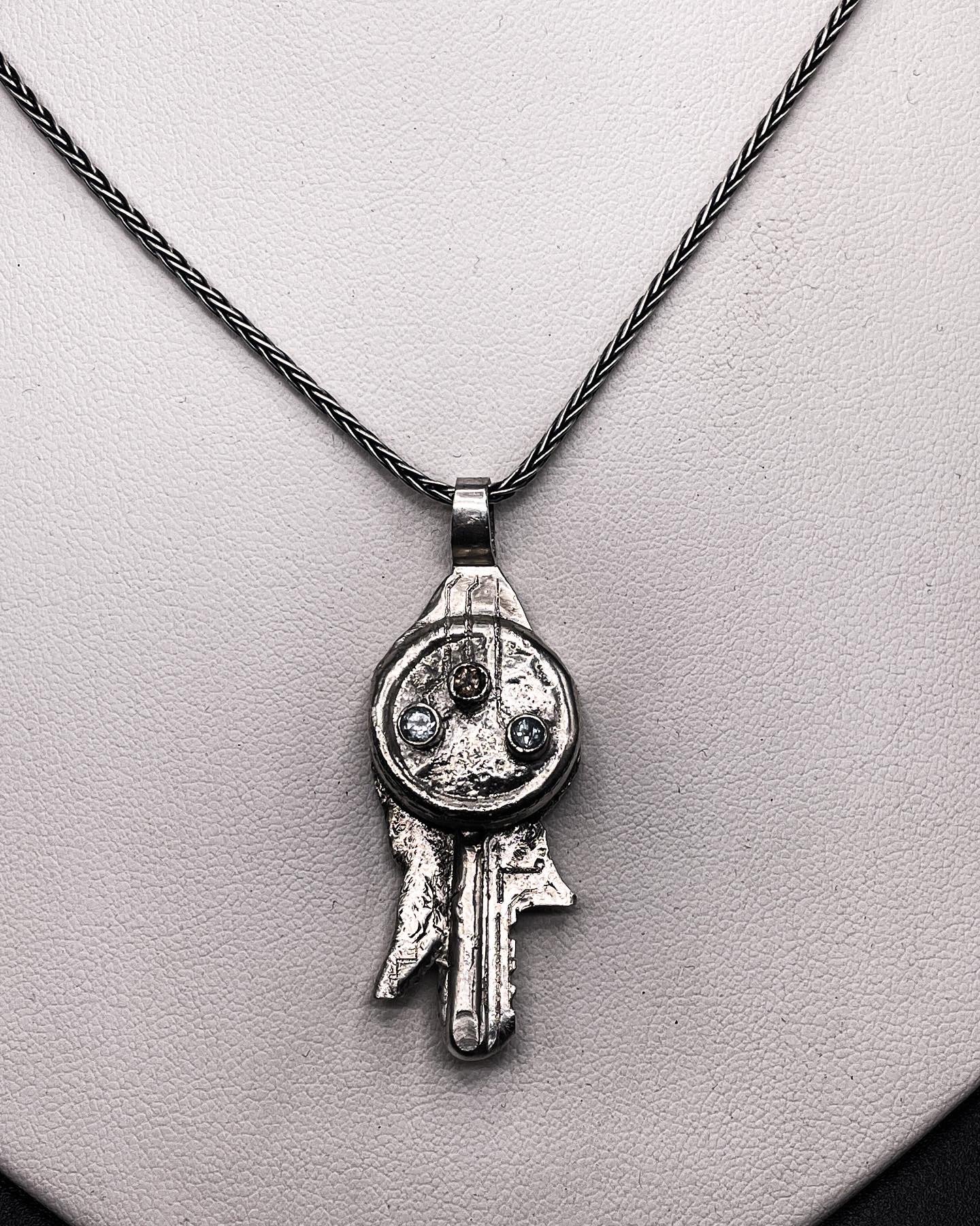 Silver pendant featuring (two) 3mm blue topaz, and one smokey quartz roundcut facets